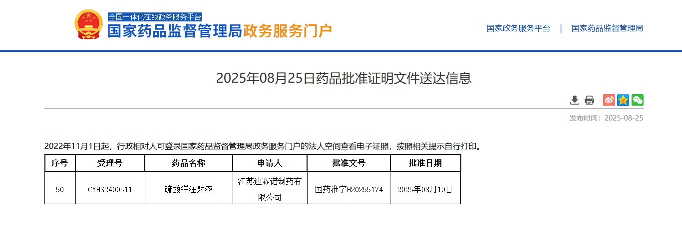 近日,安博足球_安博体育官方网站收到国家药品监督管理局签发的硫酸镁注射液获批信息通知,并在国家药品监督管理局政务服务门户平台公示。